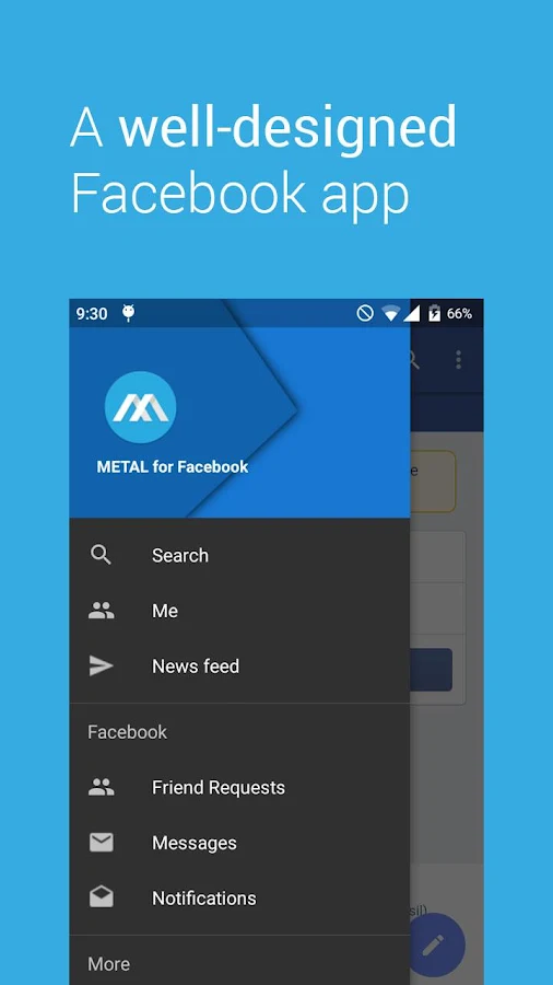 Metal per Facebook è anch'esso una versione mobile di facebook ma con le funzioni raggruppate in un menù laterale (vedi foto) che vi faciliterà la navigazione. Consuma pochi dati ed è basato su Tinfoil.